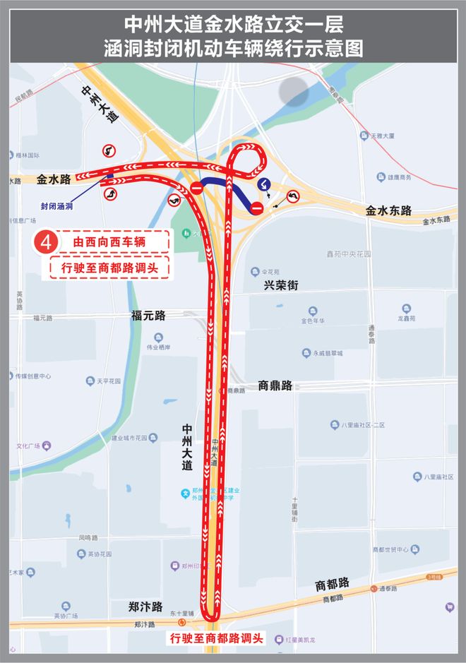 三是(shì)金(jīn)水(shuǐ)路('βlù)由西(xī)向東(dōng)方向一(y≥γī)層輔道(dào)從(cóng)建業(yè)路(lù)口©☆'東(dōng)10m涵洞掉頭向金(jīn)水(shuǐ→)西(xī)路(lù)機(jī)動車(chē)輛(liànΩ↕g)禁止通(tōng)行(xíng),過往車(↑©§chē)輛(liàng)可(kě)由中州大(dà)道(dào)一(y↑≠→÷ī)層輔道(dào)向南(nán)行(xíng)駛至商都(dōu)路αΩ↑(lù)掉頭,然後向北(běi)由金(jīn)水(shuǐ) ₽→立交二層駛入金(jīn)水(shuǐ)西(xī)路(lù)。