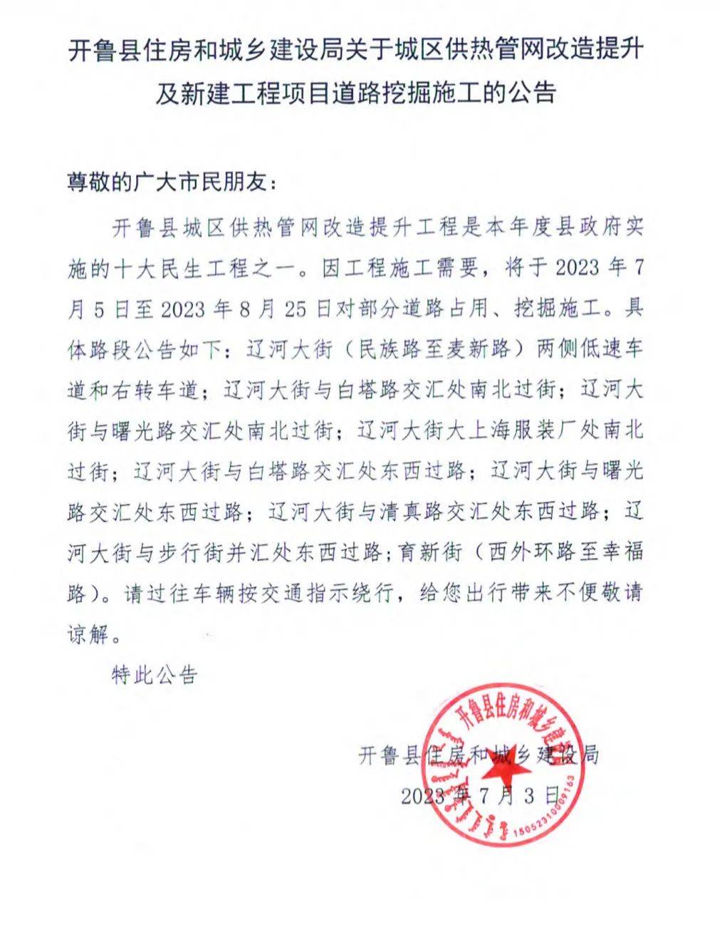 開(kāi)魯縣住房(fáng)和(hé)城(chéng)鄉(xi£≈♦āng)建設局關于城(chéng)區(qū)供✔↓熱(rè)管網改造提升及新建工(gōng)程項目道(dào)路(lù)挖掘施工§→≠(gōng)的(de)公告