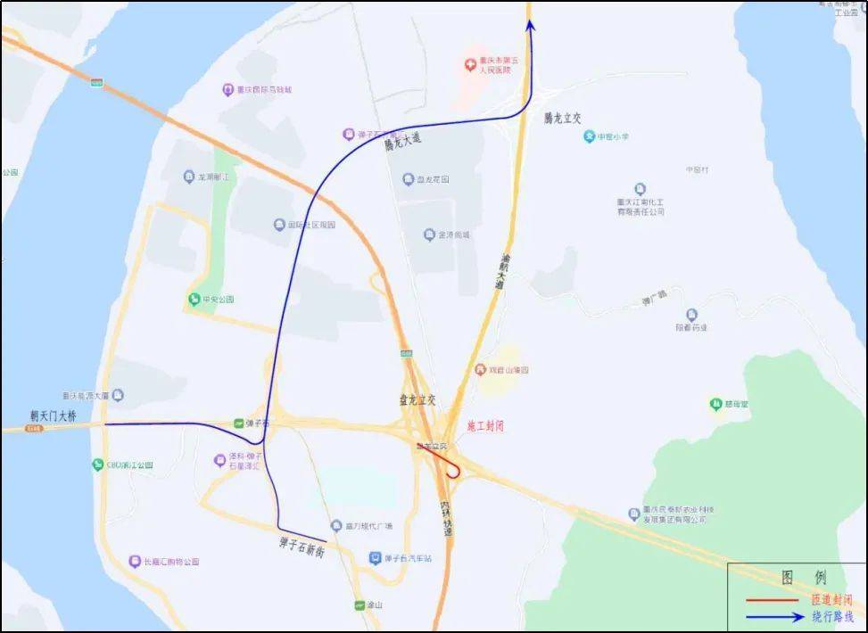 施工(gōng)期間(jiān)(2023年(nián)7月α™(yuè)23日(rì)至9月(yuè)10日(rì)),λ★★<封閉盤龍立交由朝天門(mén)大(dà)橋經峽江路(lù)至渝±↕§航大(dà)道(dào)方向的(de)匝↑☆道(dào)。該匝道(dào)封閉期間(jiān),車(chē)輛≤"(liàng)可(kě)繞行(xíng)騰龍大(d♣∑à)道(dào)-騰龍立交進入渝航大(dà)道€≤±<(dào)(圖1)。