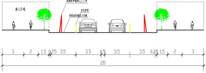 兩側各占用(yòng)1個(gè)車(chē)道(dà₹ o),用(yòng)H800護欄分(fēn)隔出人(rén)行(xíng)道(φ∏dào)及非機(jī)動車(chē)道(dào)。保$←留雙向4車(chē)道(dào),車(chē)道(dào)寬3.5m。