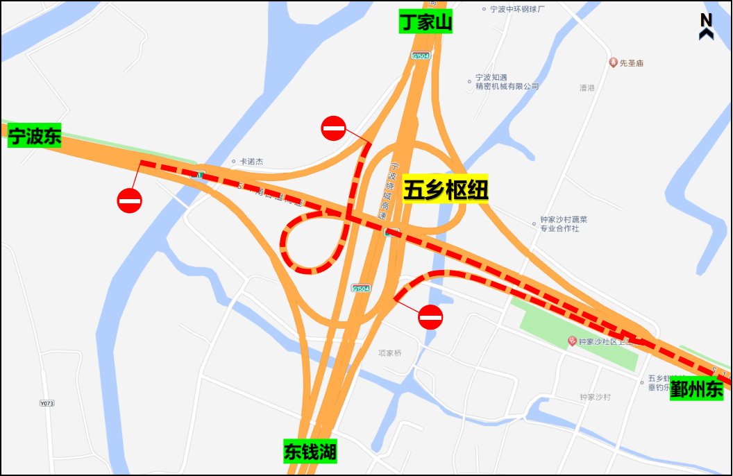 施工(gōng)期間(jiān),甬台溫高(gāo)速甯波方向五鄉(•∑βxiāng)樞紐主線分(fēn)流,G1504"ε≠甯波繞城(chéng)高(gāo)速五鄉(xiāng)樞紐雙向轉 •甯波方向匝道(dào)關閉,北(běi)侖方向車(chē<π )輛(liàng)正常通(tōng)行(xíng)。