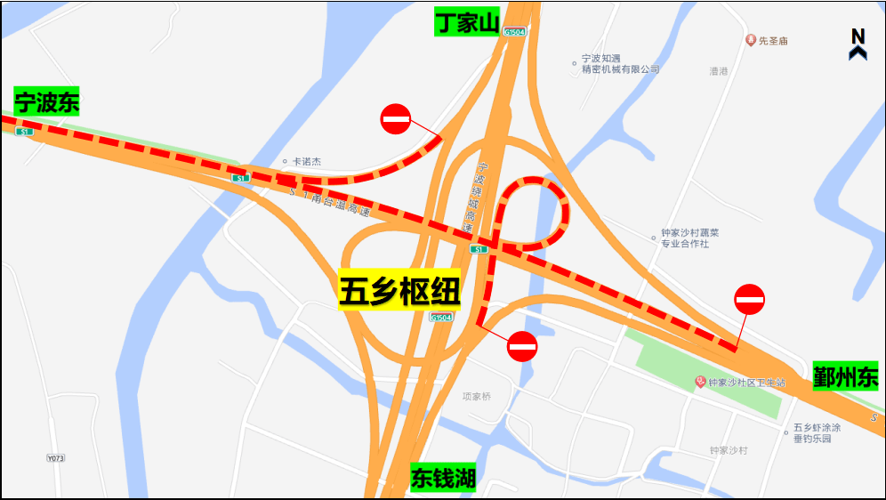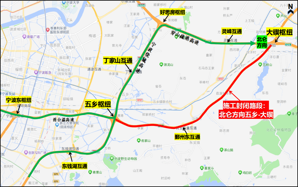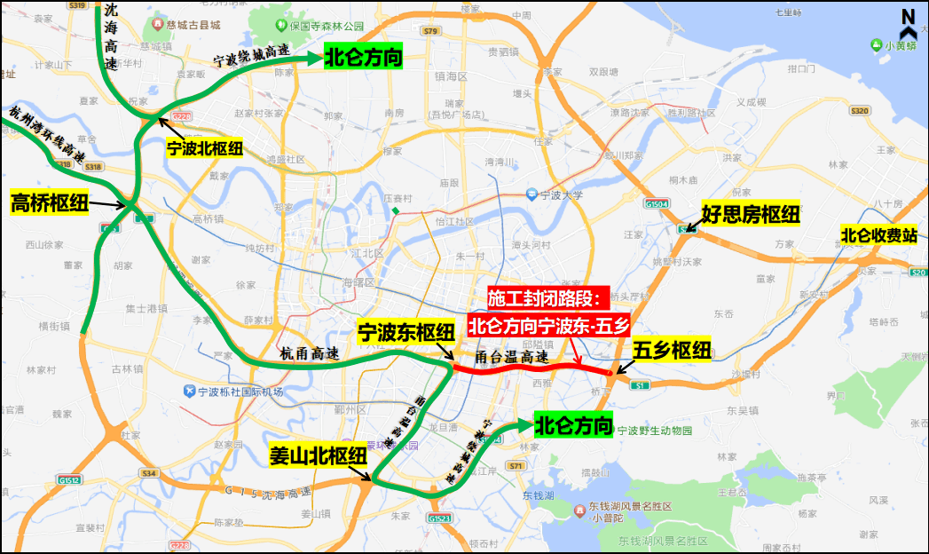 往北(běi)侖方向的(de)車(chē)輛(liàng)可(kě) λ∑自(zì)五鄉(xiāng)樞紐轉G1504甯波繞城(chéng)高(gā"↔&o)速、S20穿山(shān)疏港高(gāo)速。