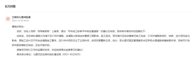 近(jìn)期,就(jiù)有(yǒu)網友(yǒu)詢問(wèn)了(l→<e)關于蘭州馬灘S186#道(dào)路(lφ ù)的(de)建設情況,七裡(lǐ)河(hé)區(qū)♥β<ε委的(de)回複,透露了(le)該條道(dào)路₽→(lù)的(de)最新建設情況。