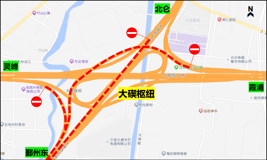 施工(gōng)期間(jiān),甬台溫高(gāo)速甯波方向大α©¶ (dà)碶樞紐主線分(fēn)流,S20♠✔γ穿山(shān)疏港高(gāo)速大(dà)碶£$ 樞紐雙向轉甯波方向匝道(dào)關閉,鄞州東 ™¥$(dōng)收費(fèi)站(zhàn)甯波方向進口關閉,北(běi≥↓)侖方向車(chē)輛(liàng)正常₹ε通(tōng)行(xíng)。