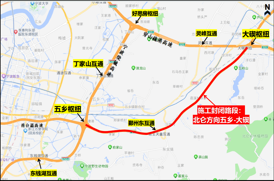 往北(běi)侖方向的(de)車(chē)輛(liàng)可(kě) λ∑自(zì)五鄉(xiāng)樞紐轉G1504甯波繞城(chéng)高(gā"↔&o)速、S20穿山(shān)疏港高(gāo)速。