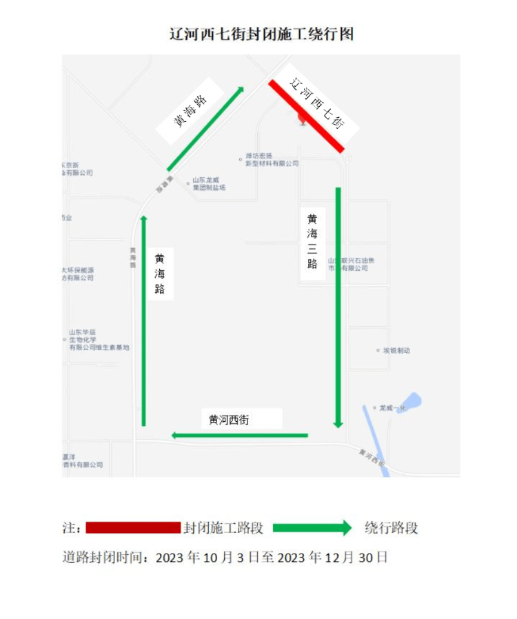 濰坊綜合保稅區(qū)北(běi)區(qū)遼河(hé)西(↔✔ xī)七街(jiē)(黃(huáng)海(hǎi)路(lε∞≤ù)-黃(huáng)海(hǎi)三路(l ™↓₹ù))全封閉施工(gōng),原定封路(δ∞ ☆lù)截止日(rì)期為(wèi)2023年(nián)11月(yu>±è)30日(rì),按照(zhào)最新施工(±↑αgōng)計(jì)劃,封路(lù)時(shí)間(jiān)需延期至2023年(n♥∏≥ ián)12月(yuè)30日(rì)。道(dào)路(lù)封閉期間(jiān),請(qǐ© ±αng)繞行(xíng)黃(huáng)河(hδ↔←é)西(xī)街(jiē)、黃(huáng)海(h¥±ǎi)路(lù)等道(dào)路(lù)。